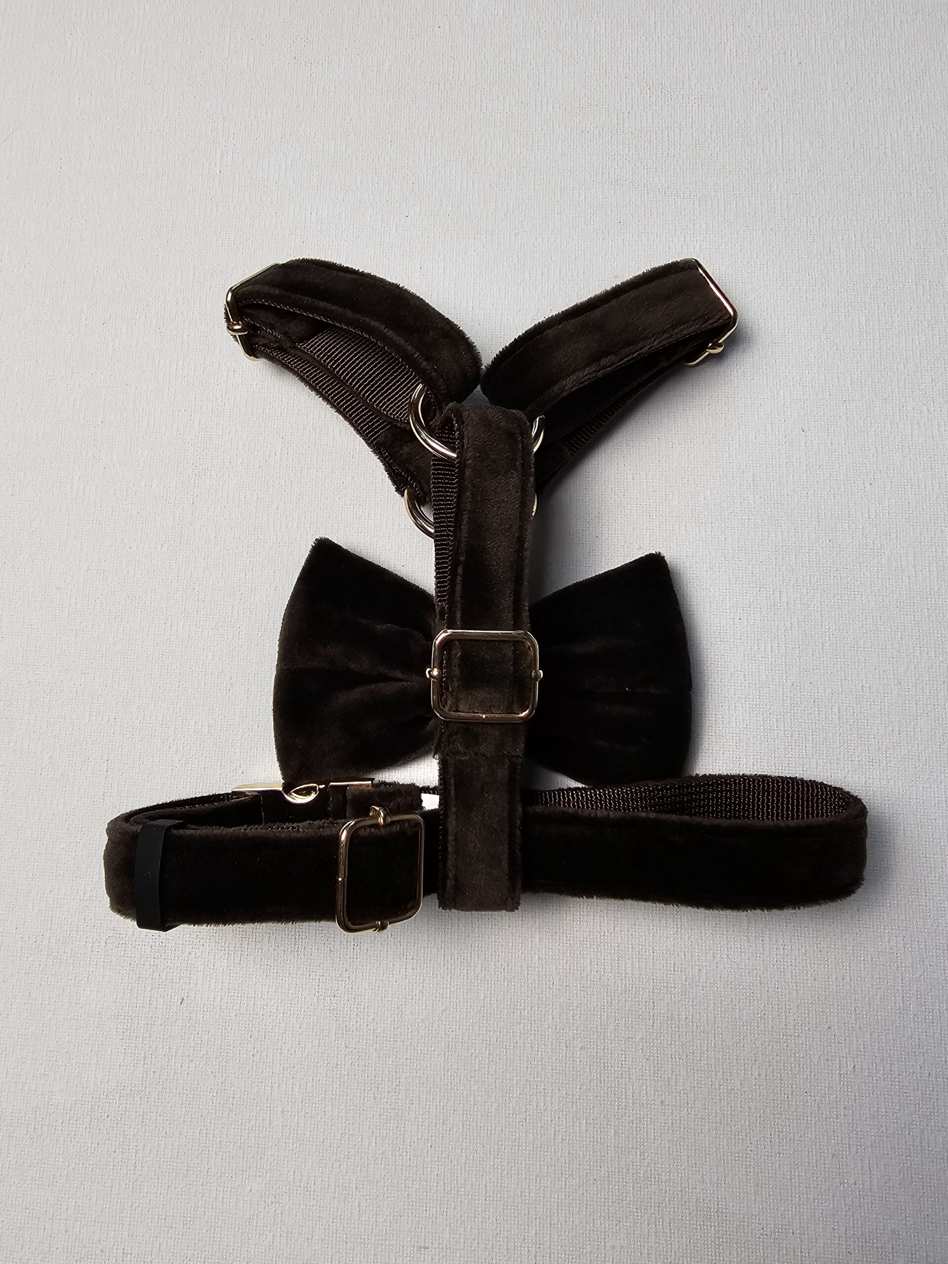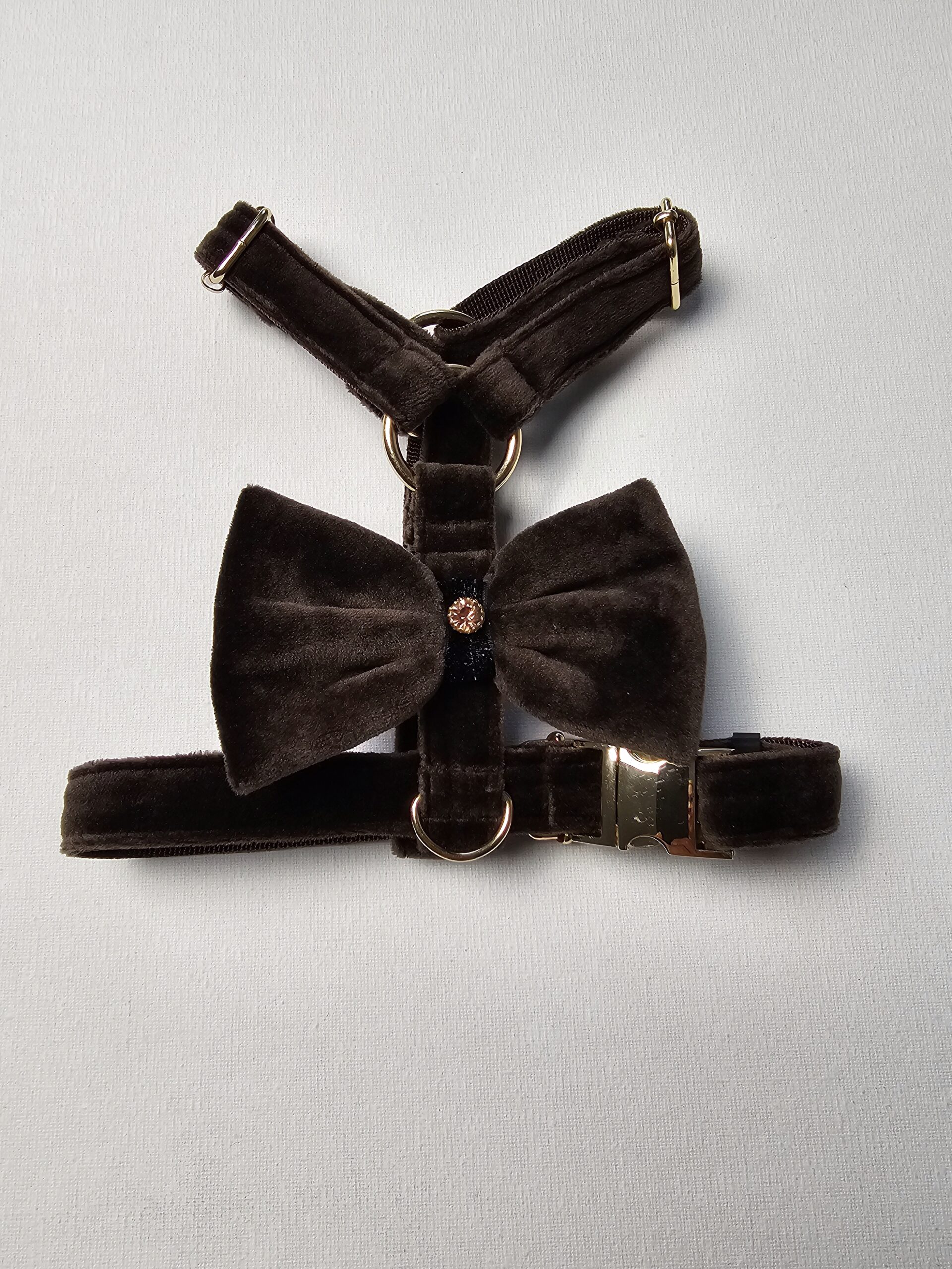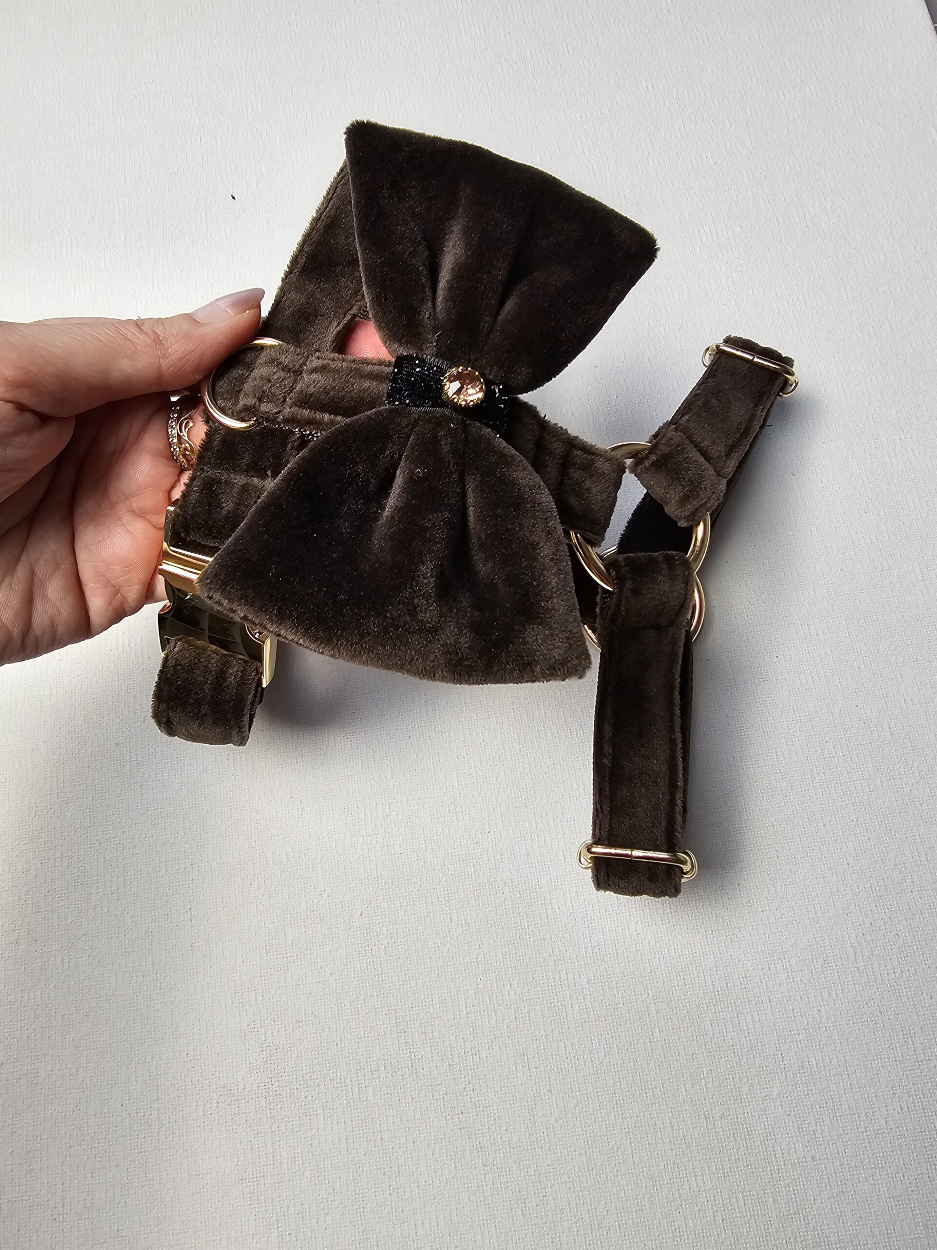 Te wyjątkowe szelki łączą w sobie elegancję i komfort, sprawiając, że Twój piesek będzie wyglądał stylowo na każdej okazji. Wykonane z miękkiego, luksusowego aksamitu w ciemno brązowym odcieniu, zapewniają wygodę noszenia i pięknie się prezentują. Ozdobna kokardka, którą można odpiąć, dodaje im uroku i pozwala na dowolne stylizowanie – idealne na codzienne spacery, jak i wyjątkowe okazje.